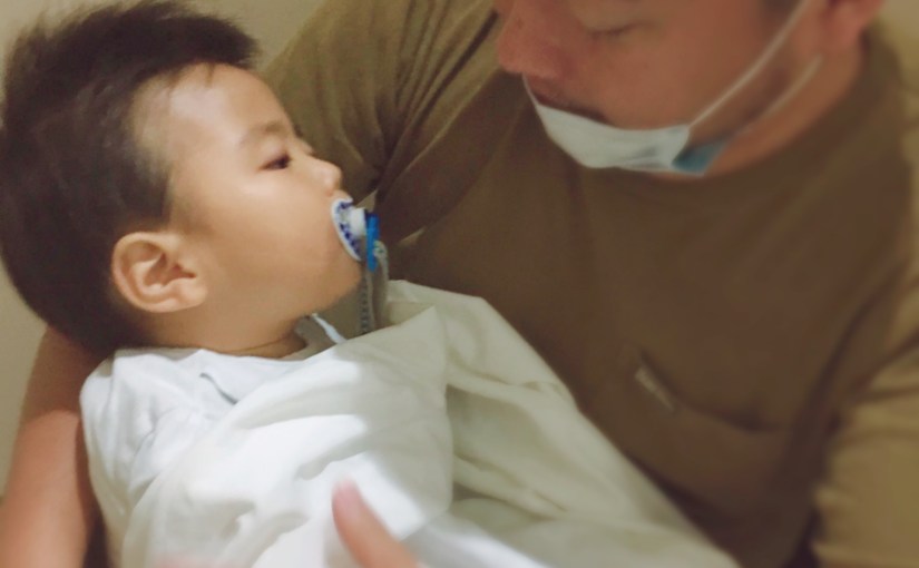 朝起きてからご飯も水分も摂らずに、朝7:30に病院へ。麻酔と手術に関するサインをした後に、手術室に入るために靴カバー、頭髪カバー、マスクをつける。息子は着替えなど特に何もなし。手術ではないと言っていたけれど、衛生的に大丈夫なのか、少し不安。