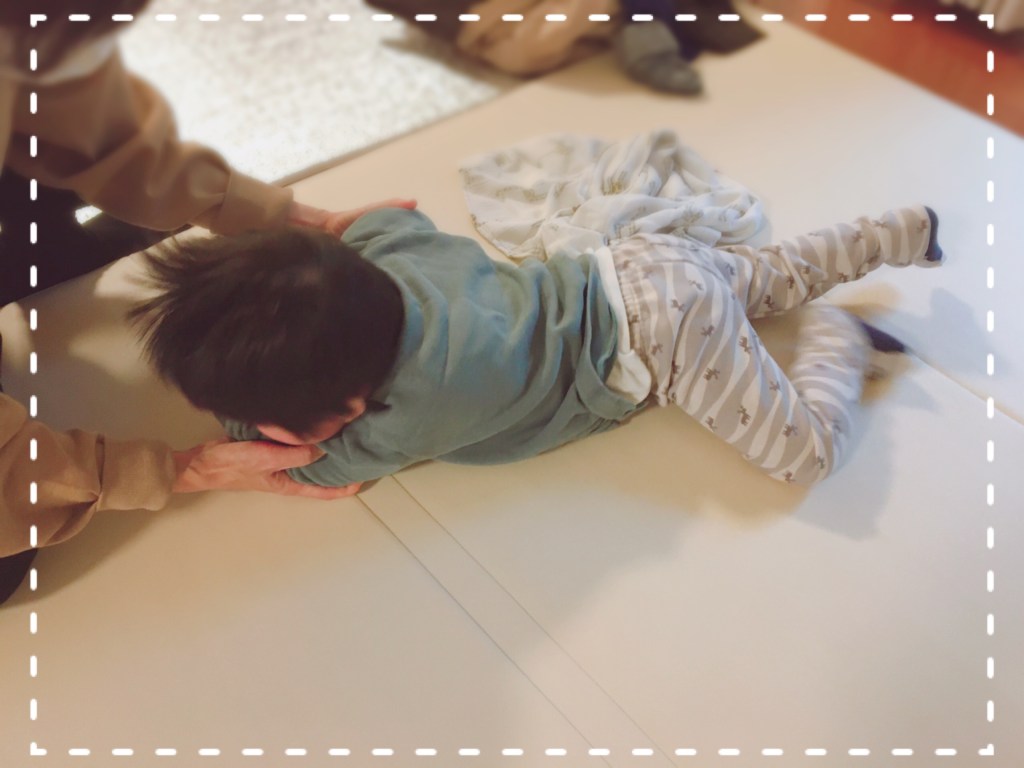 その後も、とにかく最近よく動けるようになっていて、仰向けからうつ伏せになって手もちゃんと抜けるし(逆はまだできません)、うつ伏せでアメンボみたいに手足をバラバラに動かせるし、時々まぐれでずり這いできるんじゃ…くらいの動きを見せてくれます。